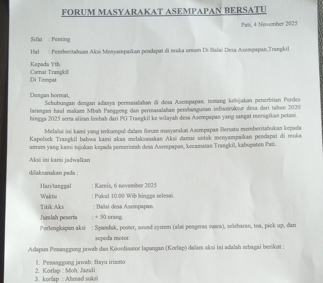 ID Realita – Warga Desa Asempapan mengatasnamakan Forum masyarakat asempapan bersatu. Hari ini, warga Asempapan akan lakukan aksi demo dan melayangkan surat pemberitahuan ke Polsek Trangkil dan jajaran muspika kecamatan Trangkil Kabupaten Pati. Ini dilakukan guna pemberitahuan bahwa masyarakat Asempapan akan menggelar aksi damai. Aksi tersebut akan dilakukan di Balai Desa Asempapan Kecamatan Trangkil Kabupaten Pati pada hari Kamis, 06 November 2025.